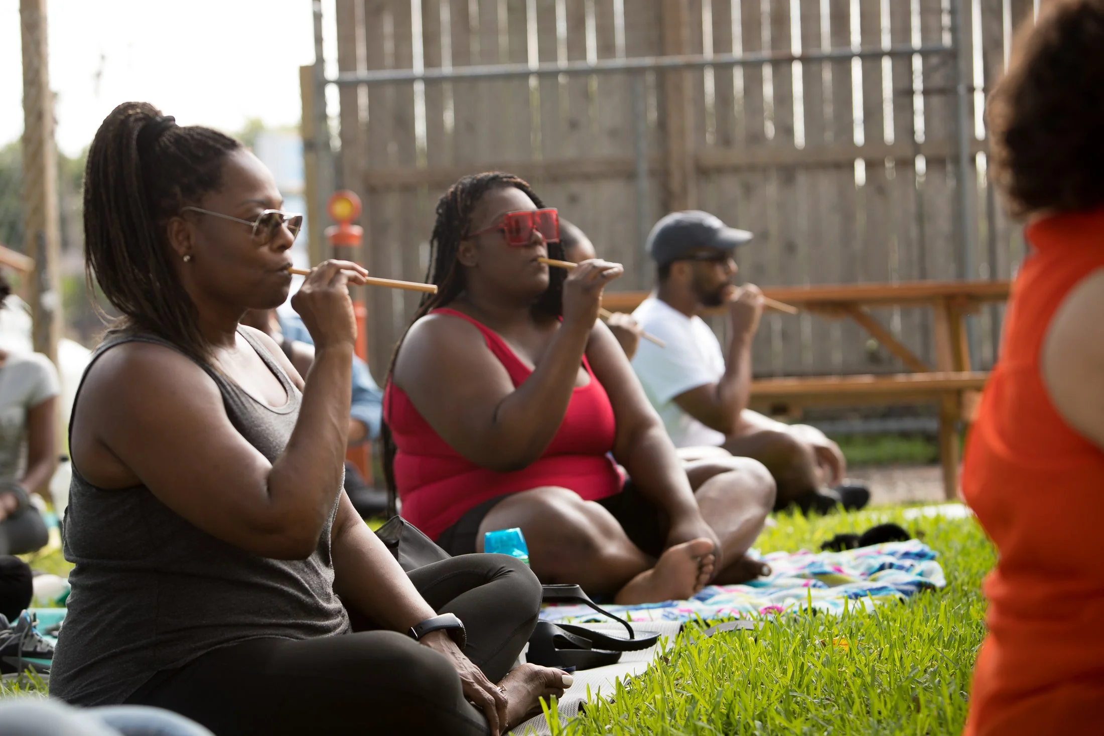 “I came into this experience with zero expectations, an open mind and ALL the nerves. I stopped practicing meditation and yoga in 2020 and this was one of my first reintroductions back into it. My anxiety was quickly extinguished from the first focus on breath and hearing Ms. Bee’s calming and thoughtful voice. The longer I stayed and the deeper I leaned in I found myself met with reciprocity and safety from the entire community of human beings that chose to come. It was a beautiful event and I will absolutely be coming back.”